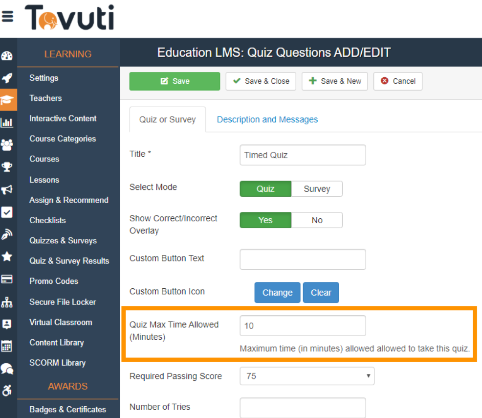 2. Go to Quiz Max Time Allowed and enter the max time allowed in minutes.