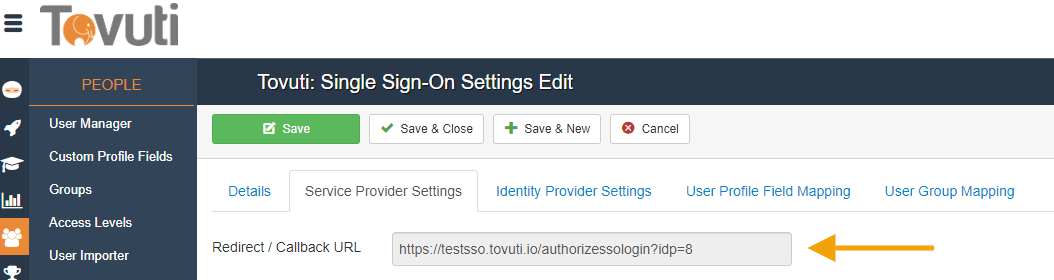 Copy and Paste the Callback URL from the Tovuti Service Provider Settings into the Callback URL Field