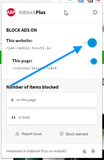 - You will see that the Toggle button is blue, meaning that AdBlock Plus is enabled. Click on the Toggle button and the extension will be disabled for the website you are on.