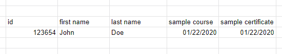 - Open the downloaded CSV > Enter the date the items should be earned (e.g. 02/04/2019). Populate the user ID with First Name and Last Name from existing users, and enter a date for the course and certificate.