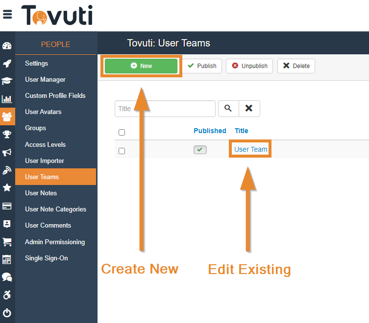 1. Click New to Create a User Team or click on an Existing User Team to edit permissions.