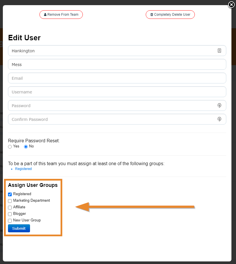 With this option enabled, a Team Lead has the ability to create new users in your website and add them to their team and approved user groups configured in the Allow Managing Team Members Groups configuration.