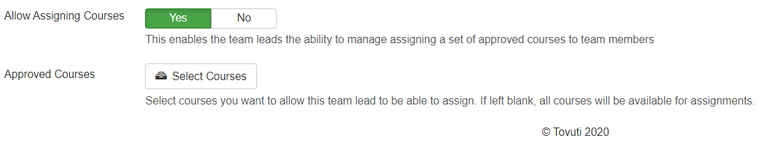 Hint: You can assign assignable courses per team by selecting "Approved" courses. This will allow you to select specific courses per team. If left blank, all courses will be available for Team Leads to assign.