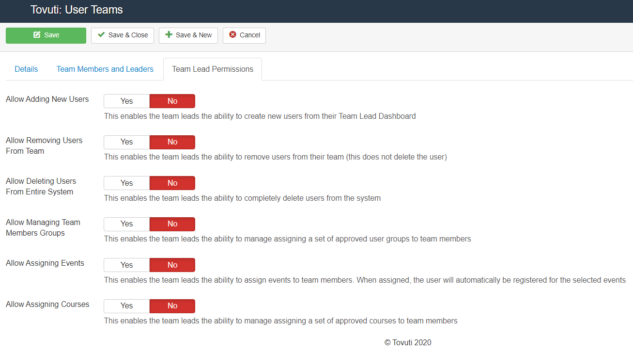 2. Go to the Team Lead Permissions Tab. Review the options available: