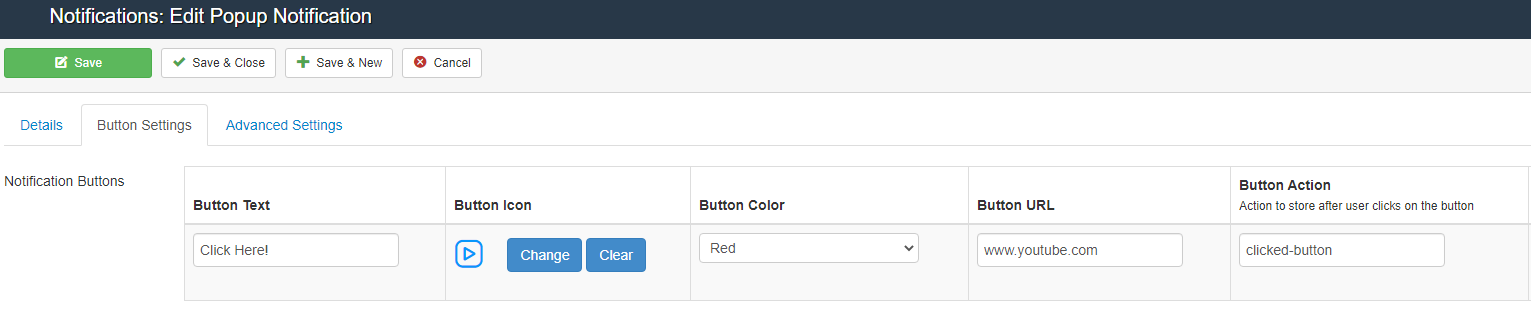 - Go to the Button Settings tab, select the Green + button to configure the text of the button in the popup