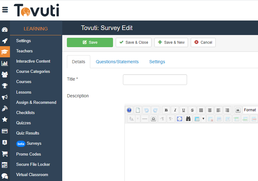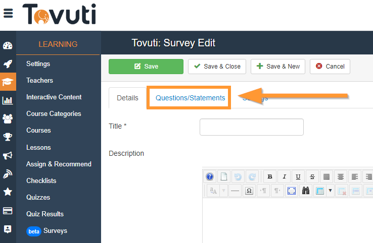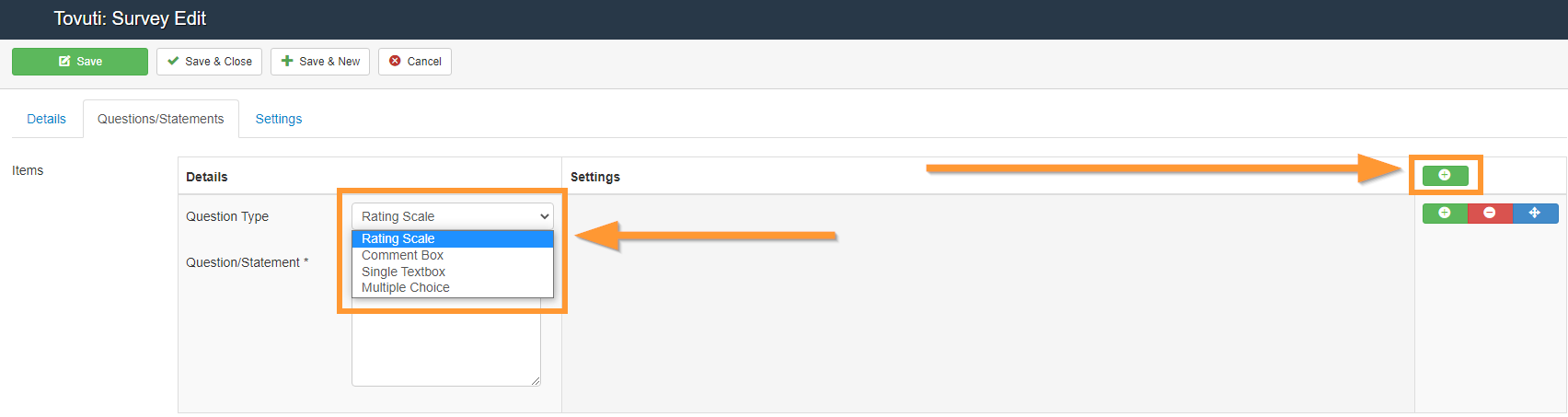 - Click on the Questions/Statements tab and Select one of the Survey Options (Rating Score, Text Area, Text Box, Multiple Choice)