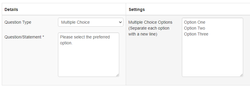 • Multiple Choice: Adds a Multiple Choice question option for your users to answer. Each option is separated by a new line (Shift+Enter).