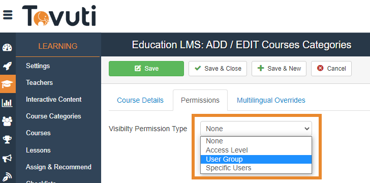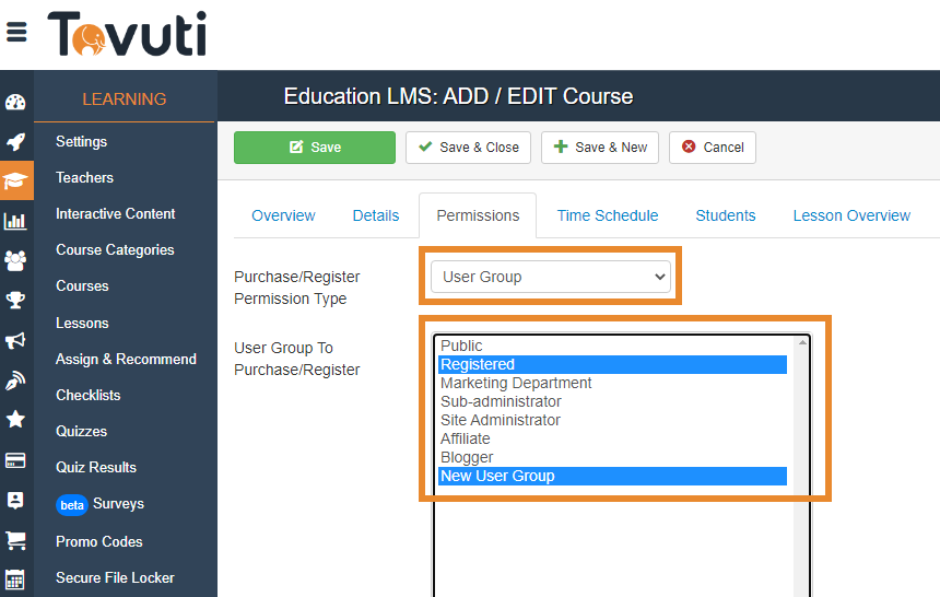 Using the Purchase/Register Permission Type selector, you can specify which access type and groups you want to be able to access a course: