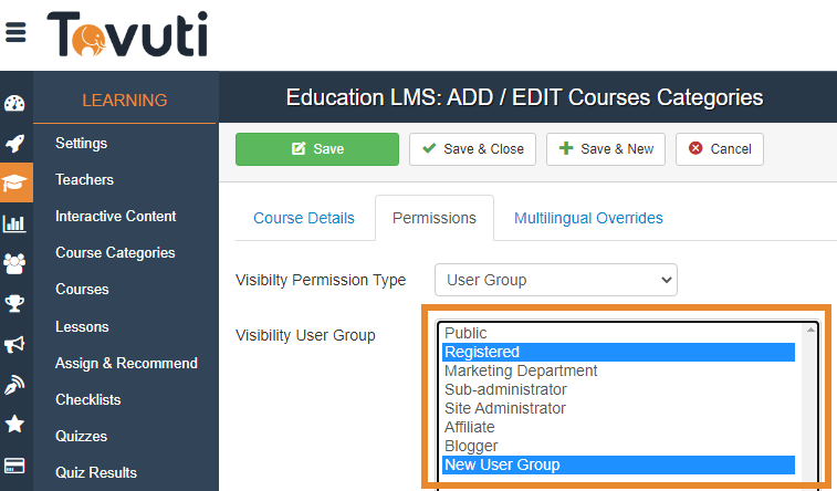 In this example, users in the Registered and New User Group user groups can access this course. If you are charging for a course this also controls whether or not users in these groups can purchase the course or not.