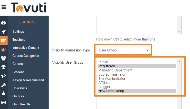 Use the dropdown to select your desired permission type and select the groups that can see this course: