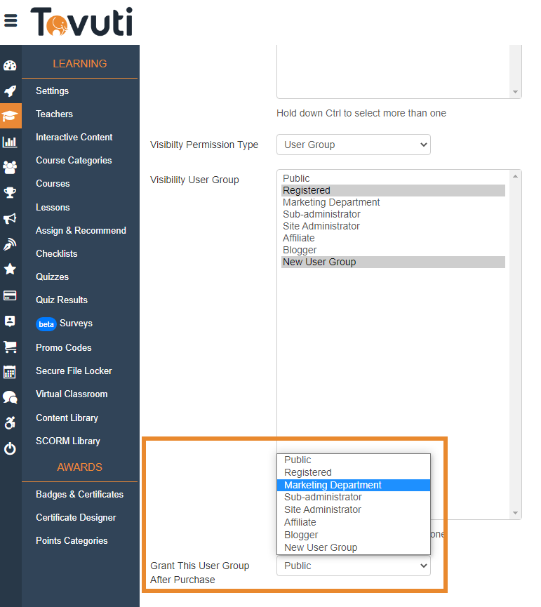 The final option in Course Permissions is you can grant a user a user group automatically after they begin or purchase a course. Select the user group you want the user to be automatically added to after they begin a course by selecting the group in the dropdown highlighted below: