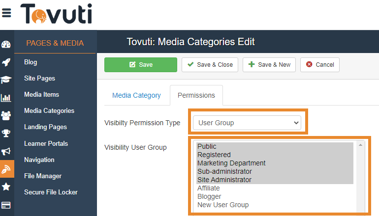 Using User Groups is the recommended approach for controlling visibility and access to content you create in your site. You can control visibility and access to the below sections: