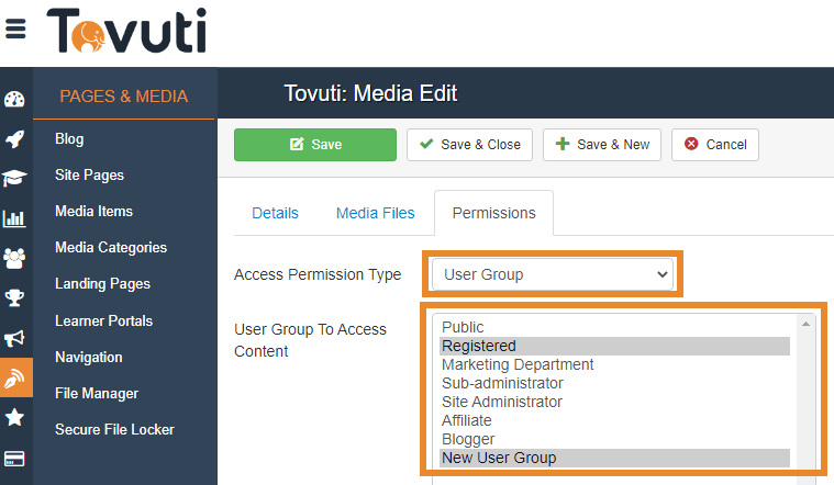 Using the Access Permission Type selector, you can specify which access type and groups you want to be able to access a Media File: