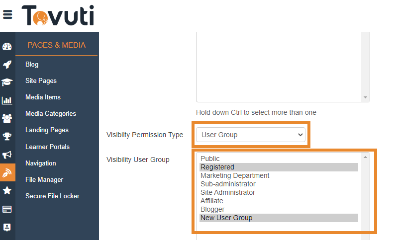 Our Tovuti Recommended approach is to use User Groups whenever possible. You can select one or more use groups to give viewing access to the selected groups: