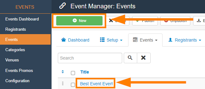 To get started, click "New" in the Event Menu to create a new event, or click on an Event you already created to edit it: