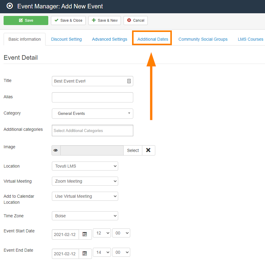 Configure the event as normal according to our Configure an Event article, then go to the Additional Dates tab: