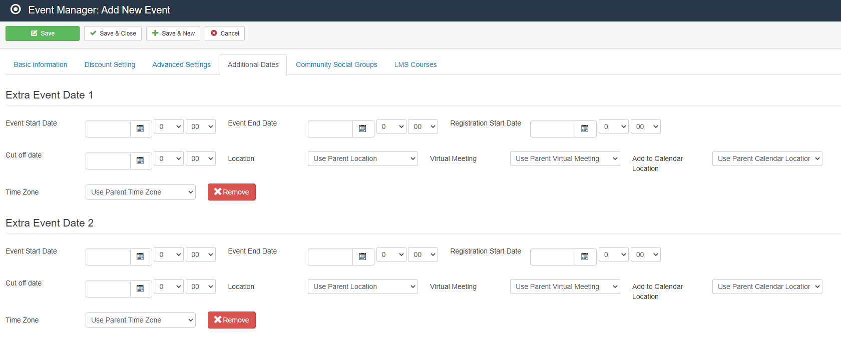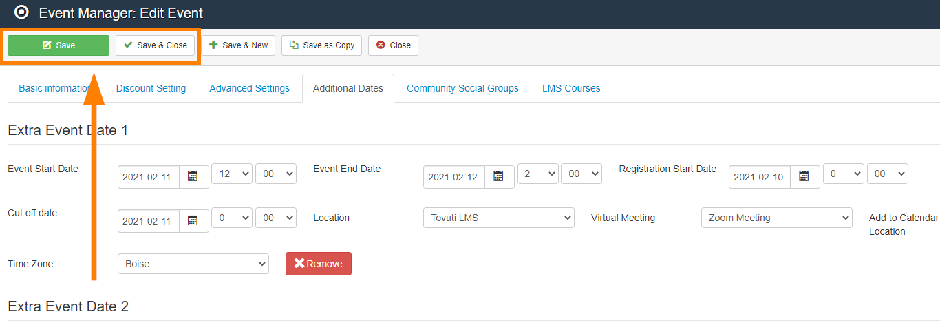 Select and Configure the additional dates available for users to register to, as well as the location they use.