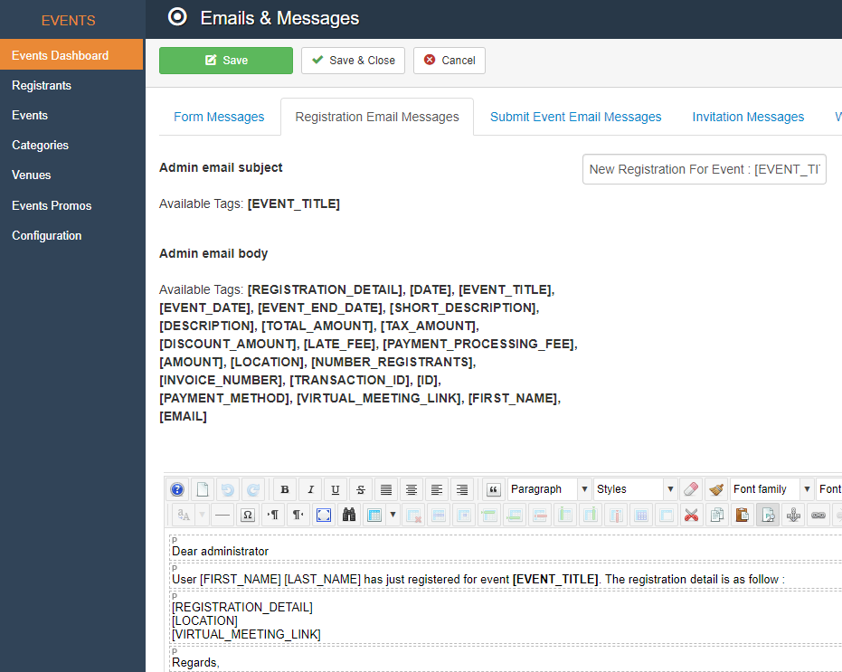 Note: If you would like to include the physical or virtual meeting location in the Registration Confirmation email that registrants receive, you can go to the Events Dashboard Emails & Messages section to update the default template to include the appropriate merge tags: