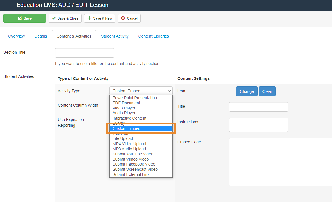 To add a Custom Embed HTML activity to your lesson, simply go switch the Activity Type to Custom Embed!